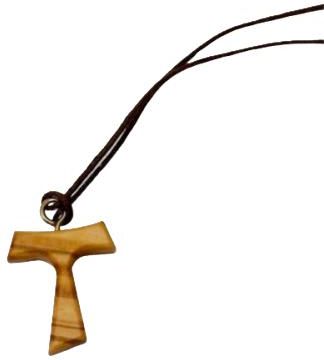 Krzyż Tau z drewna oliwkowego na sznurku, do założenia na rękę lub na szyję. Święty Franciszek przyjął i używał znaku Tau podczas Soboru Laterańskiego IV. Uczynił to pod wpływem mowy papieża Innocentego III, nawiązującej do widzenia Ezechiela (Ez 9,4-6), zawierającej wezwanie: „Pan rzekł do niego: …