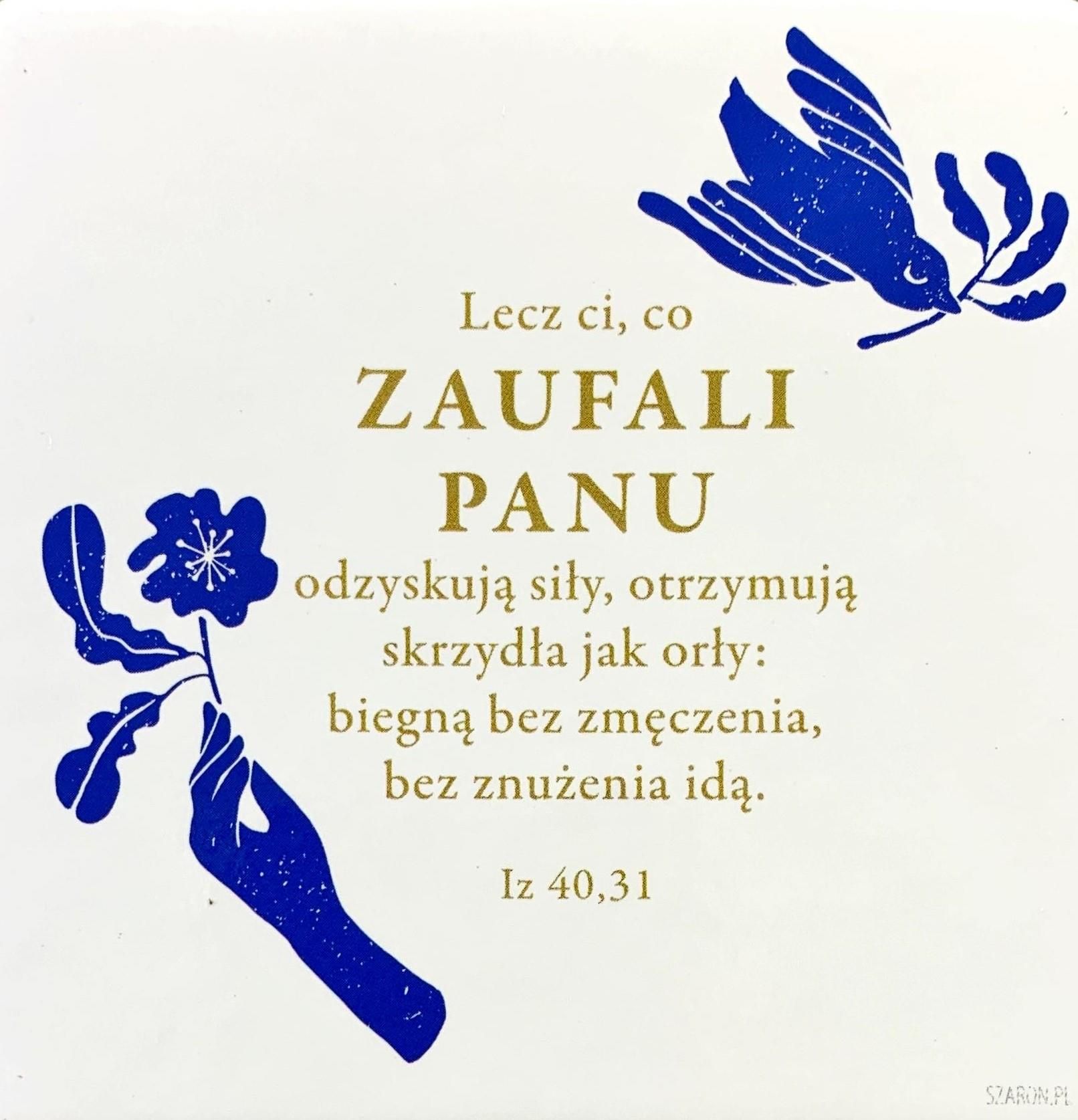 Podstawka korkowa pod kubek o wymiarach 10 x 10 cm. Napis: Lecz ci, co zaufali Panu, odzyskują siły, otrzymują skrzydła jak orły: biegną bez zmęczenia, bez znużenia idą. Iz 40,31