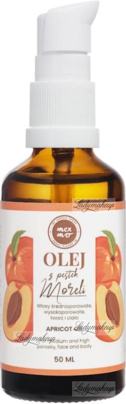 Apricot Oil marki Mexmo. Wegański olej z pestek moreli. Jest doskonałym emolientem, czyli posiada dobre właściwości nawilżające, natłuszczające i odżywcze. Ma charakterystyczny orzechowy zapach i półprzezroczystą konsystencję. Skierowany jest ku pielęgnacji włosów średnio i wysokoporowatych oraz skóry twarzy (każdy rodzaj, również wrażliwa, mieszana czy trądzikowa) i ciała. Przyspiesza procesy regeneracji naskórka, przeciwdziała procesom starzenia, a także poprawia napięcie. Jednocześnie łagodzi stany zapalne skóry, przez co wykorzystywany jest przy takich schorzeniach jak świerzb czy egzema. Na pasmach i skórze tworzy warstwę okluzyjną, chroniącą przed utratą wilgoci. Olej może być stosowany jako dodatek do kosmetyków, kąpieli bądź bezpośrednio na skórę i włosy.Olej z pestek moreli. Jest 100% wegański. Do włosów, twarzy i ciała. Intensywnie nawilża, natłuszcza i regeneruje.SPOSÓB UŻYCIA:1. Nałóż niewielką ilość oleju na suche lub zwilżone włosy przed ich myciem. Pozostaw na włosach na godzinę. Spłucz wodą i umyj skórę głowy szamponem, a na długość włosów nałóż dużą porcję maski do włosów, aby zemulgować odżywki.2. Dodaj kilka kropel oleju do ulubionej odżywki i nałóż na włosy na 20 minut. Spłucz i wykonaj pozostałe kroki jak w punkcie pierwszym.3. Nałóż kilka kropel oleju na dłonie i rozetrzyj go, a następnie nałóż na wilgotne końcówki włosów. Po wysuszeniu możesz dołożyć małą ilość oleju na włosy.4. Nałóż kilka kropel oleju pod krem nawilżający lub na koniec pielęgnacji twarzy, aby stworzyć na niej warstwę okluzyjną, która na dłużej zatrzyma nawilżenie w skórze.5. Nałóż niewielką ilość oleju na skórę głowy przed myciem, wykonaj masaż opuszkami palców lub specjalnym masażerem. Pozostaw na 40 minut. Spłucz wodą. Skalp umyj szamponem lub odżywką przeznaczoną do skóry głowy. Następnie przejdź do kolejnych etapów mycia i pielęgnacji włosów.
