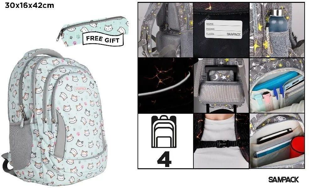 Plecak szaro-miętowy kotki czterokomorowy 30x16x42cm piórnik w zestawie