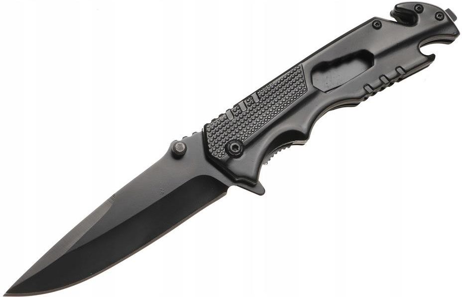 Nóż składany Głownia typu Drop point utwardza sztych dzięki czemu nóż bardzo dobrze tnie. Idealny nóż myśliwski, ale również roboczy Cechy produktu: Nóż wykonany z wysokiej jakości stali Stalowy uchwyt z nakładkami ze stali Klips umożliwia zapięcie na pasek Od spodu otwieracz do butelek oraz zbijak do szyb W rączce dodatkowe ostrze do przecinania Uchwyt umożliwia odkręcanie śrub sześciennych (kluczoczkowy) o średnicy 8, 9, 10 oraz 12 mm Rękojeść typu Frame lock Bardzo ostry Wygodnie leży w dłoni Scyzoryk składany Bardzo solidne wykonanie Długość ostrza: 10 cm Długość noża: 23 cm Długość noża złożonego: 13 cm