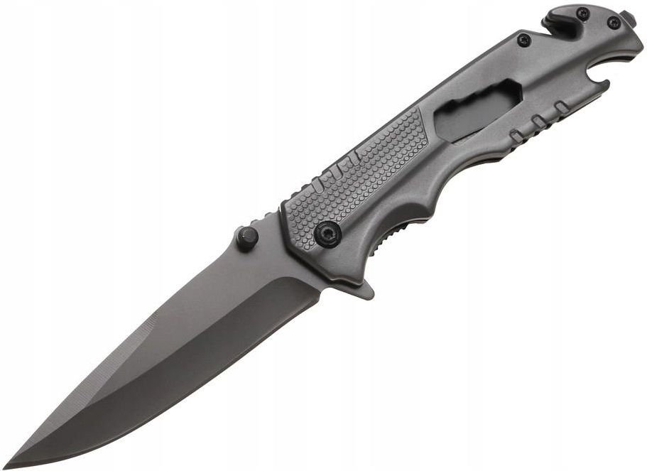 Nóż składany Głownia typu Drop point utwardza sztych dzięki czemu nóż bardzo dobrze tnie. Idealny nóż myśliwski, ale również roboczy Cechy produktu: Nóż wykonany z wysokiej jakości stali Stalowy uchwyt z nakładkami ze stali Klips umożliwia zapięcie na pasek Od spodu otwieraczdobutelek oraz zbijak do szyb W rączce dodatkowe ostrze do przecinania Uchwyt umożliwia odkręcanie śrub sześciennych (klucz oczkowy) o średnicy 8, 9, 10 oraz 12 mm Rękojeść typu Framelock Bardzo ostry Wygodnie leży w dłoni Scyzoryk składany Bardzo solidne wykonanie Długość ostrza: 10 cm Długość noża: 23 cm Długość noża złożonego: 13 cm