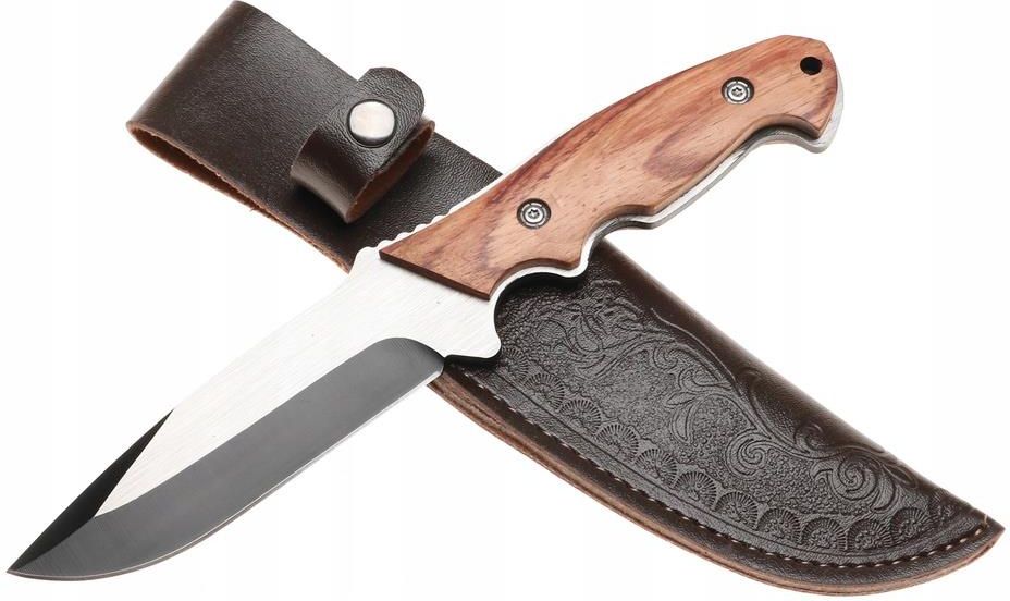 Nóż myśliwski Głownia typu Drop point utwardza sztych dzięki czemu nóż bardzo dobrze tnie. Idealny nóż myśliwski, ale również roboczy Cechy produktu: Nóż wykonany z wysokiej jakości grubej stali Bardzo ostry Wygodnie leży w dłoni Głownia typu Drop point Rękojeść typu full tang (pełny trzpień) Uchwyt z drewnianych nakładek, mocowany na dwa piny Otwór na linkę Bardzo solidne wykonanie Długość ostrza: 11 cm Długość noża: 23,5 cm W zestawie materiałowy pokrowiec