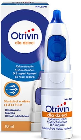 Otrivin Dla Dzieci 500 mcg/ml Aerozol Do Nosa 10 ml Otrivin dla dzieci 0,5 mg/ml to aerozol do nosa na katar przeznaczony dla osób w wieku od 2 do 11 lat. Lek zawiera chlorowodorek ksylometazoliny, który obkurcza naczynia krwionośne w błonie śluzowej nosa. Preparat skutecznie zmniejsza obrzęk i przekrwienie nosa, dzięki czemu łagodzi uczucie zatkania i ułatwia dziecku swobodne oddychanie w czasie przeziębienia, kataru siennego, alergii czy zapalenia zatok. Otrivin dla dzieci do nosa wzbogacono o składniki nawilżające, które chronią śluzówkę nosa przed wysychaniem i podrażnieniem, co jest szczególnie istotne przy dłuższym stosowaniu. Lek zaczyna działać już po około dwóch minutach od podania, a efekt utrzymuje się nawet do 12 godzin. Otrivin dla dzieci 0,5 mg/ml należy stosować zgodnie z zaleceniami, nie dłużej niż przez 10 kolejnych dni. Wskazania Nadmierne przekrwienie błony śluzowej nosa występujące w przebiegu przeziębienia, kataru siennego, alergicznego zapalenia błony śluzowej nosa, zapalenia zatok. Lek ułatwia odpływ wydzieliny z zapalnie zmienionych zatok przynosowych. Dzięki zmniejszaniu przekrwienia błony śluzowej jamy nosowo-gardłowej, może być stosowany wspomagająco w zapaleniu ucha środkowego. Otrivin dla dzieci ułatwia wziernikowanie nosa (badanie jamy nosowej). Skład: Substancją czynną leku Otrivin dla dzieci jest ksylometazoliny chlorowodorek. Jeden ml roztworu zawiera 0,5 mg ksylometazoliny chlorowodorku.  Pozostałe składniki leku to: benzalkoniowy chlorek, disodu edetynian, sodu diwodorofosforan dwuwodny, disodu fosforan dwunastowodny, sodu chlorek, sorbitol 70%, hypromeloza 4000, woda oczyszczona. Dawkowanie Ten lek należy zawsze stosować dokładnie tak, jak to opisano w tej ulotce dla pacjenta lub według zaleceń lekarza. W razie wątpliwości należy zwrócić się do lekarza lub farmaceuty. Otrivin dla dzieci należy stosować wyłącznie do nosa (również w zapaleniu ucha środkowego). W celu uniknięcia szerzenia się zakażenia jedno opakowanie leku powinno być stosowane tylko przez jednego pacjenta. Dzieci w wieku od 2 do 5 lat (pod nadzorem dorosłych): 1 dawka aerozolu Otrivin dla dzieci do każdego otworu nosowego 1 do 2 razy na dobę (co 8 – 10 godzin). Nie należy stosować więcej niż 3 razy na dobę. Dzieci w wieku od 6 do 11 lat (pod nadzorem dorosłych): 1 lub 2 dawki aerozolu Otrivin dla dzieci do każdego otworu nosowego 2 do 3 razy na dobę. Nie należy stosować więcej niż 3 razy na dobę. Leku Otrivin dla dzieci nie należy stosować u dzieci w wieku poniżej 2 lat. Stosowanie u dzieci w wieku od 2 do 11 lat powinno odbywać się pod nadzorem dorosłych. Zaleca się, aby ostatnią dawkę leku przyjąć bezpośrednio przed pójściem spać. Nie stosować dawki większej niż zalecana, zwłaszcza u dzieci i osób w podeszłym wieku. Sposób stosowania Lek jest przeznaczony do stosowania do nosa. Należy uważać, aby nie rozpylać aerozolu do oczu. Nie należy obcinać końcówki aplikatora. Aerozol jest gotowy do użycia. Zdjąć nasadkę ochronną. Przed pierwszym użyciem należy 5 razy nacisnąć pompkę. Pompka będzie gotowa do dalszego używania przez cały zalecany okres stosowania (nie należy stosować leku dłużej niż przez 10 kolejnych dni). W przypadku, gdy po całkowitym naciśnięciu pompki aerozol nie zostanie rozpylony, albo w przypadku, kiedy lek nie był używany przez okres dłuższy niż 7 dni, należy ponownie przygotować pompkę poprzez 2-krotne naciśnięcie. Oczyścić nos. Butelkę należy trzymać pionowo, kciukiem przytrzymując dno butelki, końcówkę trzymać między dwoma palcami. Pochylić głowę do przodu i umieścić końcówkę w otworze nosowym. Nacisnąć pompkę i jednocześnie wciągnąć nosem powietrze, aby zapewnić optymalną dystrybucję aerozolu. Powtórzyć czynności podczas podawania leku do drugiego otworu nosowego. Po użyciu nałożyć nasadkę ochronną. Przeciwwskazania Kiedy nie stosować leku Otrivin dla dzieci?: jeśli pacjent ma uczulenie na ksylometazoliny chlorowodorek lub którykolwiek z pozostałych składników tego leku.  jeśli pacjent przebył operację wykonywaną przez nos, np. usunięcie przysadki lub operację przebiegającą z odsłonięciem opony twardej (operacja mózgu wykonywana przez nos lub usta). jeśli pacjent ma jaskrę z wąskim kątem przesączania (podwyższone ciśnienie w oku). jeśli u pacjenta błona śluzowa nosa jest bardzo sucha (wysychające zapalenie błony śluzowej nosa lub zanikowe zapalenie błony śluzowej nosa). u dzieci w wieku poniżej 2 lat. To jest lek. Dla bezpieczeństwa stosuj go zgodnie z ulotką dołączoną do opakowania. Nie przekraczaj maksymalnej dawki leku. W przypadku wątpliwości skonsultuj się z lekarzem lub farmaceutą.