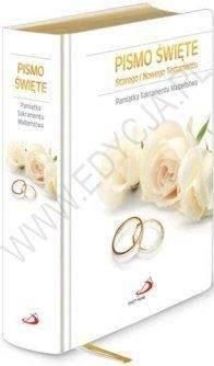"Pismo Święte Starego i Nowego Testamentu. Pamiątka Sakramentu Małżeństwa" to księga, wydana przez Edycję Świętego Pawła, w białej, twardej oprawie ze złotym wyciskiem oraz z okolicznościową obwolutą. Opatrzona jest złoconymi brzegami stron, które podkreślają wyjątkowość tego podarunku na nową drogę życia dla nowopoślubionych małżonków."Pismo Święte Starego i Nowego Testamentu. Pamiątka Sakramentu Małżeństwa" to najnowszy przekład Pisma Świętego z komentarzem, opracowany przez Zespół Biblistów Polskich z inicjatywy Towarzystwa Świętego Pawła. To pierwszy przekład w trzecim tysiącleciu, teraz do nabycia w pięknej obwolucie na tę wyjątkową okazję, jaką jest Sakrament Małżeństwa. Ten, tak ważny w życiu chrześcijanina sakrament, w czasie którego dwie osoby tworzą rodzinę i wspólnotę, nad którą czuwa Ojciec, to moment, który warto uhonorować wspólną dla nowej rodziny Biblią.Opracowując niniejsze Pismo Święte, redaktorzy tego wydania starali się zachować maksymalną wierność tekstowi oryginalnemu, z uwzględnieniem w tłumaczeniu zasad współczesnego literackiego języka polskiego. Dlatego Pismo Święte charakteryzuje się dbałością o to, aby jak najlepiej oddać po polsku sens oryginalnego tekstu biblijnego. W tłumaczeniu i komentarzach uwzględnione zostały współczesne badania nad Pismem Świętym. Dzięki nowoczesnemu i przejrzystemu układowi graficznemu księgi, można sprawniej korzystać z Pisma Świętego, w czym pomagają również przypisy z informacjami koniecznymi do zrozumienia tekstu biblijnego, umieszczone na zewnętrznych marginesach stron. Pismo Święte zawiera również komentarze do poszczególnych fragmentów, na które podzielony jest tekst biblijny, ukazujące główne myśli oraz przesłanie w nich zawarte. Na wewnętrznych marginesach stron umieszczone są odnośniki do innych miejsc w Biblii, a skrócone nazwy ksiąg wraz z zakresami tekstu biblijnego, umieszczone w dolnych rogach stron, ułatwiają szukanie wybranego miejsca w Piśmie Świętym. Do księgi dołączony jest też słownik, wyjaśniający 186 terminów biblijnych oraz tablice chronologiczne i mapy, które przybliżają kontekst historyczny i geograficzny wydarzeń biblijnych.Księga ta wyróżnia się unikaniem w przypisach i komentarzach specjalistycznego języka teologicznego, jednak przed każdą księgą i zbiorami ksiąg (np. Ewangeliami) umieszczono zwięzłe wprowadzenia, pozwalające czytelnikowi uchwycić kontekst powstania danej księgi lub zbioru ksiąg, a także istotę zawartej w nich treści.
