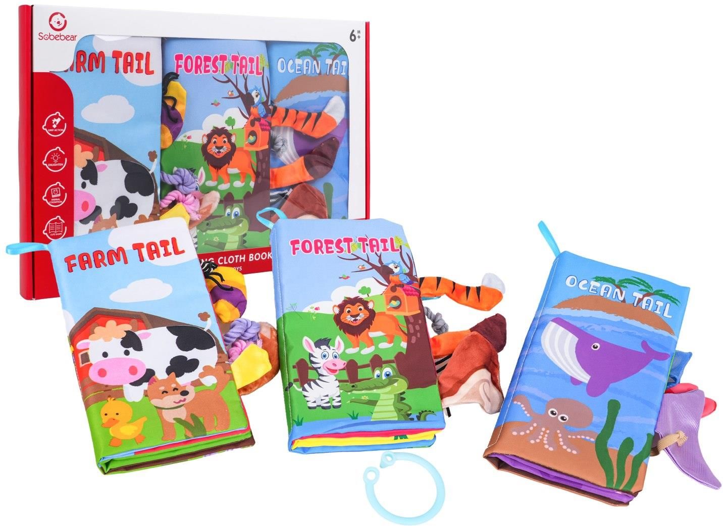 Opis Zestaw Trzech Książeczek Sensorycznych Dla Najmłodszych Zestaw miękkich książeczek sensorycznych dla maluszka od szóstego miesiąca życia. Zestaw wykonany został z najlepszej jakości materiałów bezpiecznych dla maluszków. Szeleszczące i miękkie w dotyku strony stymulują zmysły maluszka na wielu płaszczyznach. Żywe kolory przyciągają wzrok dziecka i zachęcają do edukacyjnej zabawy. Na miękkich kartkach znajdują się rysunki wielu zwierzątek. Pierwsza książeczka przedstawia zwierzątka leśne, druga zwierzątka na farmie, a trzecia różne zwierzaki morskie. Każde zwierzątko jest podpisane w języku angielskim. Z każdej ze stron wystają ogonki z różnych materiałów zrobione. Książeczki są wodoodporne i łatwo się je czyści. Funkcje: odpowiednie dla dzieci już od szóstego miesiąca, wykonane z bezpiecznych materiałów, są miękkie i wodoodporne, posiadają rysunki różnych zwierzątek, uczą nazywać zwierzątka w języku angielskim, z każdej strony wystaje ogonek różnego zwierzaka, opowiadają o zwierzątkach leśnych, zwierzątkach morskich czy safari, kartka pierwsza i ostatnia każdej książki jest szeleszcząca. Wymiary - książeczka złożona (bez ogonków) ok. 23 cm x 12,5 cm x 3 cm, - opakowanie ok. 36 cm x 24 cm x 3 cm. Zawartość zestawu - 3 miękkie książeczki z ogonkami zwierzaków. - zawieszka do książek.