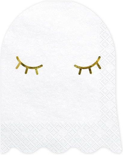 Serwetki Duch Biały+złoto Przyjęcie Halloween Serwetki Duch doskonale sprawdzą się podczas imprezy Halloween. Wykonane z wysokiej jakości materiałów, w kolorze białym, z subtelnym, złotym metalizowanym nadrukiem. Po rozłożeniu mają wymiary około 22,5 x 28 cm, co zapewnia wygodę użytkowania, a po złożeniu ich kompaktowe wymiary wynoszą 11 x 14 cm. W jednej paczce znajduje się 20 sztuk serwetek. Boo! Ssstrrraaasznie dobra oferta! Cena za komplet. Jednostka miary: op.