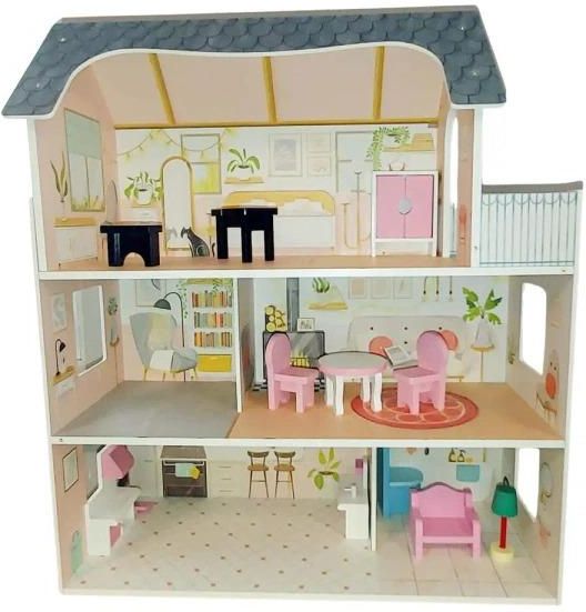 Domek dla lalek drewniany, z balkonem i dachem Ten piękny, drewniany domek dla lalek zachwyca szczegółami i starannym wykończeniem. Wykonany z solidnego drewna, ma klasyczną bryłę z niebieskim daszkiem oraz trzy piętra, na których znajduje się kilka pomieszczeń urządzonych w nowoczesnym stylu. …