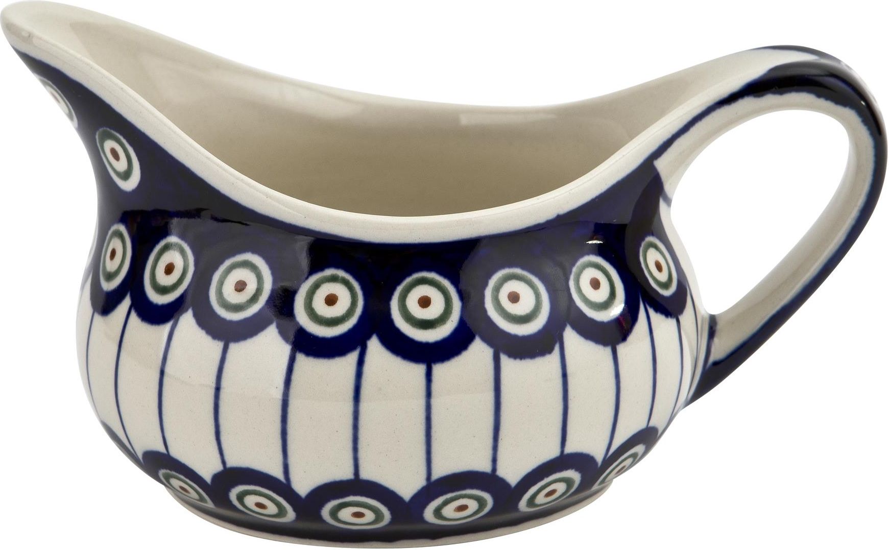 Ceramiczna sosjerka marki Bolesławiec o pięknej stylistyce i praktycznym kształcie. Kilka słów o dekoracji nr 8 - „Pawie oczka” nawiązują do tradycyjnych motywów dekoracyjnych, wśród których przeważały oczka w trzech kolorach: kobaltu, zieleni i brązu. Kółka, kreski, kremowe tło – to wszystko …