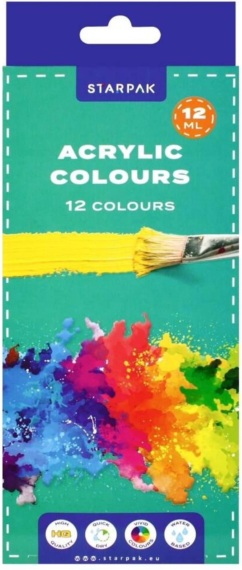 Farby akrylowe w tubie 12ml. 12 kolorów ISBN: 5904335879599 Wydawnictwo: Starpak Przedmiot nauczania: Nie dotyczy Poziom nauczania: Nie dotyczy Zalety produktu Farby akrylowe 12 kolorów w tubkach 12 ml STARPAK. Trwałe i szybkoschnące farby kryjące odporne na blaknięcie. Duża trwałość. Duża swoboda w doborze i mieszaniu barw. Farby nieprzeźroczyste, odpowiednie do nauki malowania. Można nimi malować papier, drewno, płótno oraz tkaniny. Zapoznaj się również z innymi produktami Starpak Farby odpowiednie do malowania techniką klasyczną. Farby są bardzo wydajne. Nieodpowiednie dla dzieci poniżej 3 lat. Wymiary opakowania wys. x szer. x gł. cm 26x11x2. Waga opakowania kg. 0,20 kg. Pakowane iner 10szt. Karton 60 szt. Cechy produktu mieszanka pigmentu, spoiwa syntetycznego i wody, konsystencja zbliżoną do farb olejnych, kryjące, po wyschnięciu gładka, trwała i elastyczna powłoka, odporne na blakniecie, rozcieńczalne wodą.