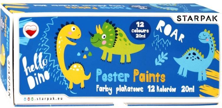 Farby plakatowe Starpak - narzędzie dla małych artystów Ten niezwykły zestaw farb plakatowych Starpak to doskonała opcja dla młodych twórców. Składający się z 12 nasyconych kolorów, produkt ten doskonale stymuluje wyobraźnię. Znakomicie skomponowana konsystencja farb zapewnia precyzyjne pokrycie malowanej powierzchni, jednocześnie zaskakująco długo zachowując swoją żywotność. Atrakcyjne opakowanie, ozdobione inspirującymi ilustracjami z Dino, podkreśla atrakcyjność produktu. Wszystkie farby są starannie zapakowane w oddzielnych, zapinanych na zakrętkę pojemnikach o pojemności 20 ml, a całość została skomponowana w estetycznym kartoniku, który dodatkowo ułatwia przechowywanie produktu. Produkt jest dumnie produkowany w Polsce. Wymiary produktu wynoszą 3cm x 4cm x 3cm, natomiast opakowania - 23cm x 4cm x 8cm. Waga produktu to zaledwie 0,04 kg, a samego opakowania - 0,50 kg. Uwaga - produkt nie jest odpowiedni dla dzieci poniżej trzeciego roku życia. Charakterystyka produktu - Gęstość i kremowa konsystencja farb- Wysoka krycie- Intensywne i czyste barwy- Po wyschnięciu uzyskują matowe i intensywne kolory- Farby zapakowane w 20 ml pojemnikach- Dostępne w 12 intensywnych kolorach- Łatwo zmywalne z ubrań, stołów, podłóg za pomocą zwykłej wody Szczegóły Starpak Farby Plakatowe to gęste farby na bazie wody o kremowej konsystencji. Są całkowicie bezpieczne dla dzieci, dzięki wykorzystaniu nieszkodliwych składników. Charakteryzują się intensywnymi i czystymi kolorami, które po wyschnięciu stają się matowe, lecz nadal pozostają żywe. Dodatkowo, ich wysoka krycie pozwala na łatwe poprawki ewentualnych błędów.Zestawy Starpak dostępne są w wersji z 12 kolorami, każdy umieszczony w oddzielnym, zamykanym pojemniku o pojemności 20 ml. Są niezwykle trwałe, a jeśli po kilku latach wyschną - wystarczy do nich dodać trochę wody, by odzyskały dawną konsystencję. Ponieważ są produkowane na bazie wody, łatwo można je usunąć z ubrań, stołów czy podłóg - wystarczy czysta woda.Farby plakatowe Starpak to w pełni polski produkt. W ofercie Starpak dostępne są 13 modeli farb plakatowych w różnych wersjach graficznych. EAN: 5904335841152
