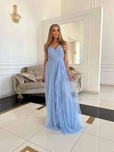 Zjawiskowa długa sukienka wykonana z miękkiego tiulu. Góra gorsetowa z marszczeniami na biuście. Z tyłlu gumeczki dzieki czemu sukienka idealnie dopasowuje się do biustu. Cieńkie regulowane ramiączka , Dół sukienki ozdobiony . delikatną falbanką. Kreacja idealnie sprawdzi się na wesele dla gościa …