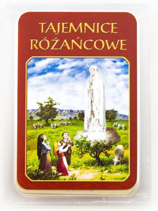 Laminowane kartki tajemnic różańcowych – radosnych, światła, bolesnych, chwalebnych – z rozważaniami.