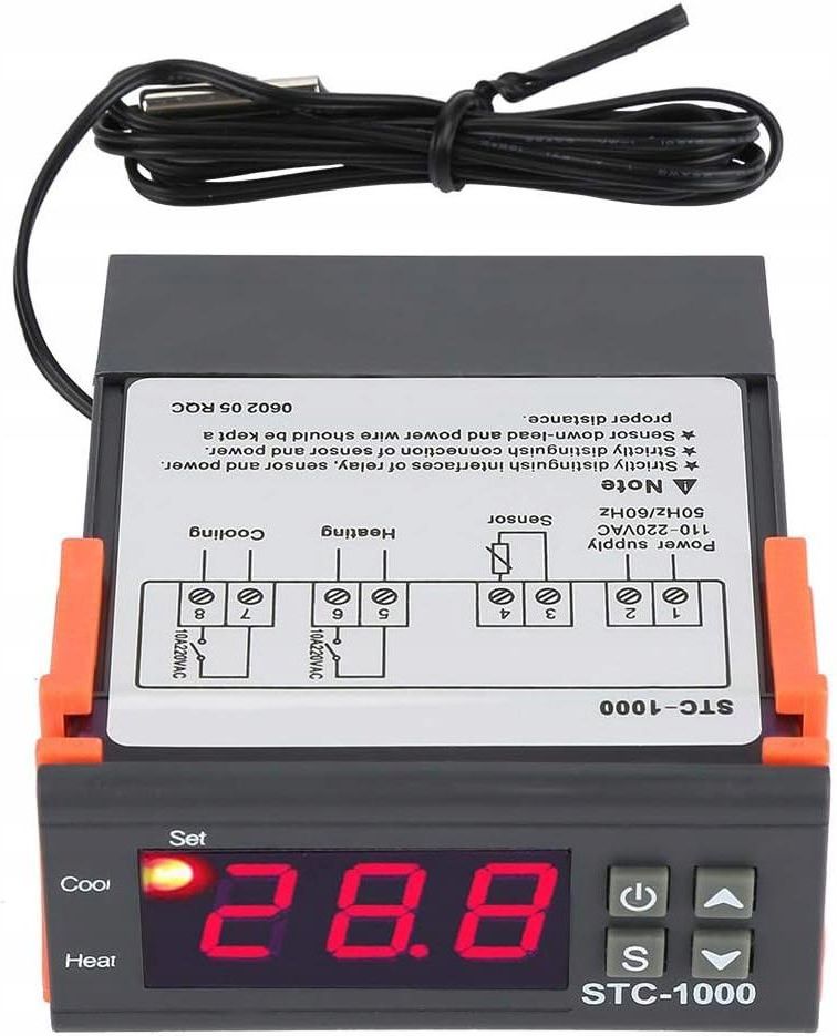 Termostat Regulator Temperatury Sterownik STC-1000 230V z sondą Uniwersalny regulator temperatury STC-1000 znajduje zastosowanie w pracy pomp CO, pomp cyrkulacyjnych, wentylatorów, lodówek, pieców, basenów, wędzarni oraz wielu innych urządzeń. Posiada czytelny wyświetlacz LED oraz wodoszczelną sondę z przewodem o długości ok. 1m. ✅ Kontrola temperatury: Możliwość precyzyjnego ustawienia temperatury w zakresie od -50°C do 110°C. ✅ Kalibracja temperatury: Umożliwia dokładne dopasowanie pomiarów do rzeczywistych wartości. ✅ Przełączanie trybów: Szybkie przełączanie pomiędzy trybami chłodzenia i grzania. ✅ Zewnętrzny termostat: Wodoszczelna sonda z przewodem o długości 1m umożliwia monitorowanie temperatury w różnych warunkach. ✅ Wyświetlacz LED: Duży i czytelny wyświetlacz LED, który ułatwia odczyt aktualnych ustawień i parametrów. ✅ Bez dodatkowego zasilacza: Nie wymaga dodatkowego zasilacza do pracy. ✳️ Specyfikacja: ✔️ Zasilanie: 230V AC ✔️ Maksymalny prąd obciążenia przekaźnika grzania: 2300W ✔️ Maksymalny prąd obciążenia przekaźnika chłodzenia: 2300W ✔️ Pobór prądu: +/- 3W ✔️ Dopuszczalna wilgotność: 20% – 85% ✔️ Pomiar temperatury: od -50°C do 110°C ✔️ Zakres regulacji temperatury: od -50°C do 110°C ✔️ Precyzja pomiaru: 0,1°C +/- 2% ✔️ Precyzja sterowania temperaturą: 0,1°C ✔️ Zakres zmiany histerezy: 0,3°C do 10°C ✔️ Zakres kalibracji czujnika temperatury: od -10°C do 10°C ✔️ Zakres zmiany czasu opóźnienia przekaźnika: od 0 do 10 minut (Opóźnienie możliwe tylko na przekaźniku chłodzenia) ✔️ Precyzja sterowania czasem opóźnienia przekaźnika: 1 minuta ✔️ Częstotliwość odświeżania: 0,5s ✔️ Rodzaj sondy (czujnika): NTC10k (w wodoodpornej obudowie) ✔️ Długość sondy (czujnika) z kablem: 1 metr ✔️ Średnica sondy (czujnika): 4 mm ✔️ Długość sondy (czujnika) końcówka metalowa: 20 mm ✔️ Rodzaj wyświetlacza: LED 3 cyfry ✔️ Kolor wyświetlacza: Czerwony ✔️ Sposób podłączenia przewodów: Listwa zaciskowa ✔️ Materiał obudowy: Tworzywo sztuczne ✔️ Wymiary panela przedniego: 34 mm (wysokość) x 75 mm (szerokość) ✔️ Wymiary tylnej części: 70 mm (szerokość) x 82 mm (głębokość bez panelu przedniego) x 86 mm (głębokość z panelem przednim) Instrukcja użytkowania: Sprawdzanie parametrów: Podczas pracy, wcisnąć raz przycisk ▲, aby wyświetlić zadaną temperaturę. Naciśnięcie przycisku ▼ wyświetli zadaną histerezę. Ustawianie parametrów: Podczas pracy, przytrzymać przycisk „S” przez 3 sekundy, aby uruchomić tryb nastawy temperatury (na wyświetlaczu pojawi się „F1”, dioda SET zacznie świecić). Za pomocą strzałek, przejść do kolejnych pozycji ustawień. Aby zmienić wartość ustawienia, wybrać odpowiednią pozycję, przytrzymać przycisk „S” i zmienić wartość przyciskiem ▲ lub ▼. Po ustawieniu wartości, puścić przycisk „S” i raz nacisnąć przycisk zasilania, aby zapisać ustawienia i powrócić do trybu wyświetlania aktualnej temperatury. Jeśli przez 10 sekund nie wykona się żadnej operacji, urządzenie automatycznie powróci do trybu normalnej pracy. Przywracanie ustawień fabrycznych: Po wystąpieniu błędu (wyświetlacz pokazuje „Er”), wciśnięcie dowolnego przycisku spowoduje przywrócenie ustawień domyślnych i powrót do trybu normalnej pracy.