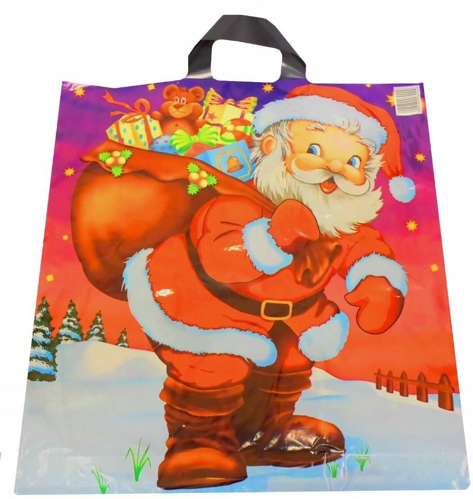 Reklamówka z uchem 40x45cm Mikołaj LD 50szt Reklamówka z uchem LDPE z nadrukiem Mikołaja z prezentami wymiary:- szerokość 40 cm, - wysokość 45 cm, - grubość 52 mikrony mocna i elastyczna, przeznaczona do pakowania zakupionych produktów. Cena dotyczy 50 sztuk kod towaru 2921
