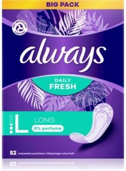 Always Daily Fresh Long. Dzięki wyjątkowemu kształtowi stanowią doskonałe połączenie komfortu i ochrony – możesz polegać na nich przez cały dzień i nawet ich nie poczujesz. Dłuższe wkładki zapewniają odpowiedni poziom ochrony, a oddychający materiał odpowiada za uczucie czystości i świeżości przez cały dzień. Idealnie wchłaniają wydzielinę pochwową i stanowią dodatkową ochronę w trakcie nieregularnych miesiączek oraz dni z lekkim krwawieniem. Te wkładki higieniczne nie zawierają substancji zapachowych. Always Daily Fresh Long, 0% substancji zapachowych, 52X