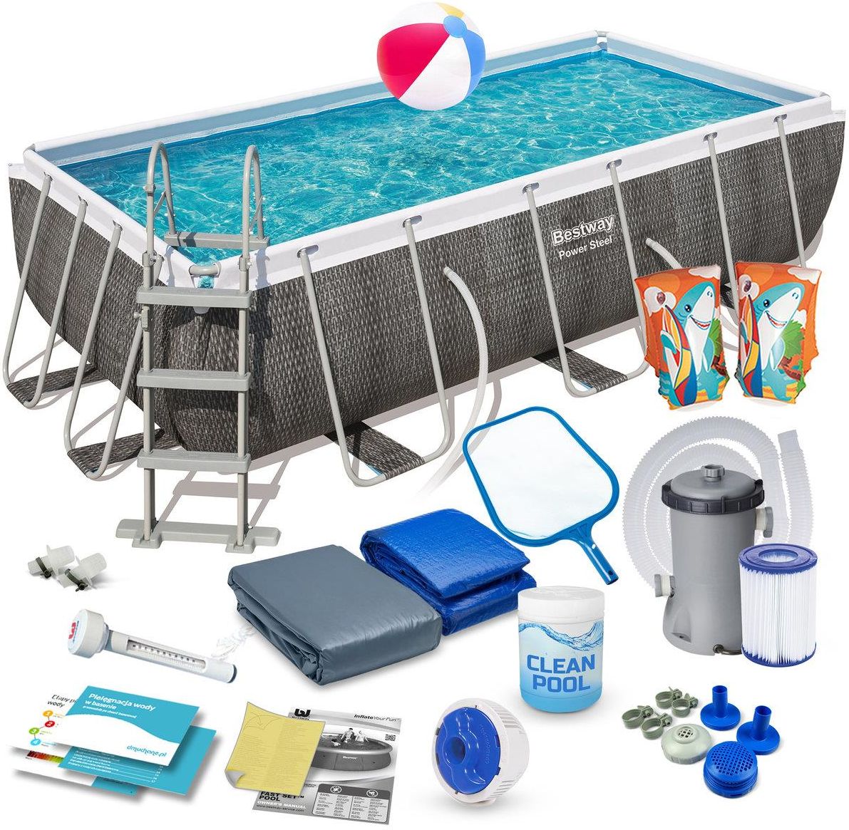 Basen ogrodowy stelażowy 404 x 201 x 100 cm 18w1 Bestway 56721 Basen ogrodowy stelażowy z pompą 404 x 201 x 100 cm Nr katalogowy Bestway® 56721 HIT ★★★★★ Jeśli potrzebujesz dużego, niezawodnego basenu, w którym będziesz mógł swobodnie pływać - to idealny wybór dla Ciebie! Gotowy zestaw z kompletnym wyposażeniem – nie musisz sam szukać wszystkich elementów. Kupując basen Bestway z dedykowanymi akcesoriami masz pewność, że otrzymasz najwyższą jakość i wszystko będzie do siebie pasować. ZAWARTOŚĆ ZESTAWU Basen stelażowy 404 x 201x 100 cm. Pompa filtrująca Filtr do pompy Chemia - Multitabletki 25x20g Rękawki do pływania Bezpieczna drabinka Pokrywa basenowa Mata pod basen Piłka plażowa Siatka do wyławiania nieczystości Termometr basenowy Sitka do pompy Zaciski do pompy Węże do pompy Łatka naprawcza Instrukcja w języku polskim Przewodnik - do pobrania w aukcji Bezpieczeństwo dziecka Odłączane stopnie uniemożliwiają wejście dzieciom bez opieki Wysokość idealnie dobrana do wielkości basenu Wzmocniony metalowy stelaż odporny na korozje Antypoślizgowe stopnie Wygodne poręcze Najwyższa jakość wykonania Wytrzymały 3-warstwowy materiał PVC Wzmocnienie z nylonowej siatki pomiędzy warstwami Powłoka odporna na przebicia Wnętrze imitujące mozaikę w kolorze biało-niebieskim Pokrywa Zabezpiecza wodę w basenie przed zabrudzeniami Uniemożliwia dzieciom wejście do basenu bez Twojej zgody Spowalnia utratę ciepła z wody Mata Zabezpiecza dno przed uszkodzeniem Chroni przed wnoszeniem do basenu piasku i innych zabrudzeń Izoluje basen od podłoża Czysta woda bez wysiłku W zestawie wszystko, czego potrzebujesz, aby uzyskać krystaliczną wodę: Pompa filtrująca Ulepszony filtr do pompy 25 multitabletek – kompleksowy środek dezynfekujący Dozownik chemii basenowej Siatka do wyławiania nieczystości Termometr basenowy Basen gotowy w 3 szybkich krokach Rozwiń powłokę, Złóż stelaż- bez użycia narzędzi Nalej wodę - gotowe! Teraz rozłożenie tak dużego basenu zajmie Ci kilka chwil Basen to rozrywka dla całej rodziny Z myślą o Twoich dzieciach dodajemy ulubione akcesoria dzieci: Rękawki do pływania, aby zabawa była bezpieczniejsza Kolorowa piłka zachęci do wspólnej zabawy dzieci i dorosłych DANE TECHNICZNE Basen Wymiary niecki basenowej 404 x 201 x 100 cm Wymiary zewnętrzne basenu 441 x 241 x 100 cm Waga 64.11 kg Zalecane wypełnienie wodą 90 % Pojemność 6 478 litrów Pompa Wydajność pompy 2006 litrów/godz Zasilanie pompy 220 - 240 V Filtr do pompy typ II Spraw by to lato było pełne cudownych wrażeń!