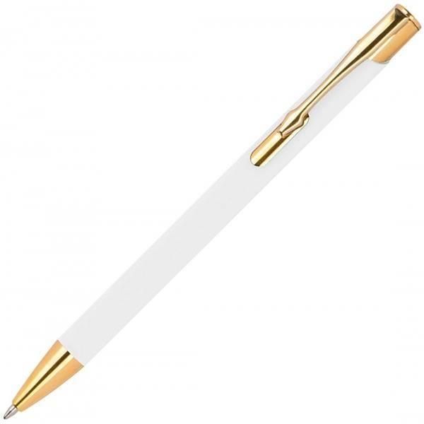 Długopis metalowy soft touch ze złotymi elementami i wkładem piszącym na niebiesko.