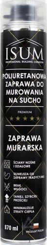 ISUM poliuretanowa zaprawa do murowania na sucho 870ml Pojemność: 870ml Wydajność: do 12m2 Temperatura otoczenia / podłoża: -10 do30 st c Przyrost piany (post ekspansja): 60-90% Współczynnik przewodzenia ciepła: 0,036 Klasa palności (DIN 4102: B3 Wykazuje bardzo dobrą przyczepność do elementów murowanych takich jak: beton komórkowy, pustaki ceramiczne, cegła, beton, tynk. Poliuretanowa zaprawa pozwala na stawianie ścian działowych oraz nośnych. Jest silniejsza od tradycyjnych zapraw! Pozwala na zaoszczędzenie dużej ilości czasu - nie musimy rozrabiać zaprawy, mamy od razu gotową do użycia! Zaprawa dzięki swoim właściwościom minimalizuje straty ciepła w pomieszczeniu. Cechy i zalety Do stawiania ścian nośnych i działowych, Silniejsza od tradycyjnej zaprawy, Brak wilgoci, Minimalizuje straty ciepła, Szybka w użyciu. Sposób użycia Przed przystąpieniem do pracy, wierzch poprzedniej warstwy należy oczyścić i zwilżyć wodą (w temp. >0stopni celsjusza) Przy szerokości elementu murowanego wynoszącej do 130mm wystarczy nałożyć jeden warkocz zaprawy, przy większych szerokościach należy nałożyć dwa warkocze, Dla elementów murowanych z betonu komórkowego warkocz powinien mieć średnicę minimum 2-3cm. Dla pustaków ceramicznych średnica warkocza 5-6cm, Kolejną warstwę nałożyć na poprzednio zaaplikowaną warstwę z zaprawą, zanim zostanie osiagniety koniec czasu otwartego. Optymalny czas to minuta po aplikacji, aby umożliwić ujście nadmiaru gazów z zaprawy PU. Po przyłożeniu elementu murowanego należy go docisnąć aby uzyskać jak najmniejszą szczelinę. Czas jaki zaprawa potrzebuje do pełnej wytrzymałości to 24 godziny. PIERWSZA WARSTWA ELEMENTÓW MUROWYCH MUSI BYĆ ZAWSZE UŁOŻONA NA ZAPRAWIE CEMENTOWEJ W CELU DOKŁADNEGO WYPOZIOMOWANIA POWIERZCHNI, NA KTÓREJ BĘDZIE STAŁ MUR!