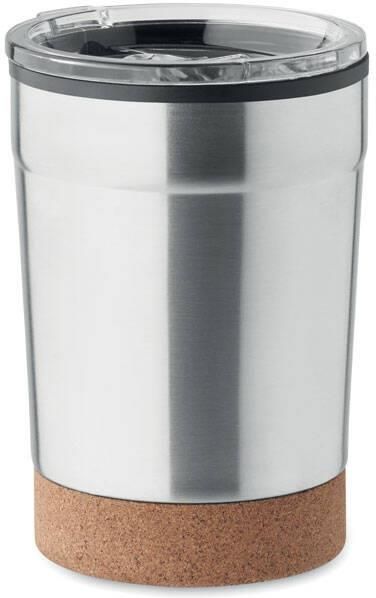 Zewnętrzna podwójna ścianka ze stali nierdzewnej i wewnętrzna strona z PP. Korkowa podstawka i przesuwane otwarcie do picia. Nie przecieka. Pojemność: 300 ml.