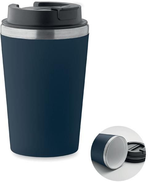 Kubek z podwójną ścianką. Zewnętrzna z PP i wewnętrzna ze stali nierdzewnej z recyklingu (90% stali nierdzewnej z recyklingu i 10% stali nierdzewnej) z ceramiczną powłoką wewnętrzną. Nie przecieka. Pojemność: 350 ml.