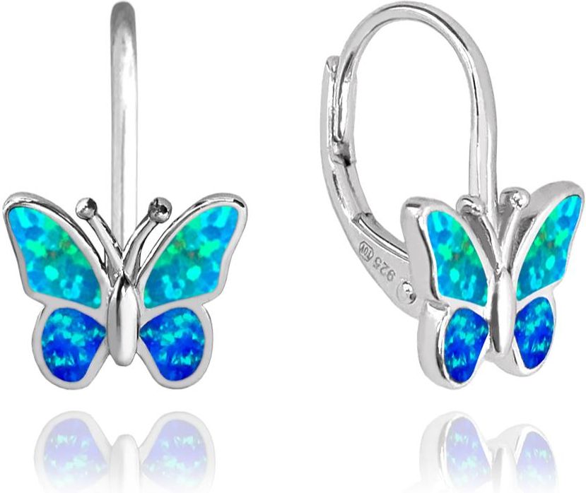 Srebrne kolczyki dziewczęce błyszczący motyl Niebieski opal. Kolczyki zostały wykonane z najwyższej jakości srebra próby 925. Urocze kolczyki w kształcie pięknego motyla. Kolczyki posiadają zapięcie na bigiel. Motylki wypełnione są opalem niebieskim. Srebrne kolczyki dla dziewczynki motylek, …