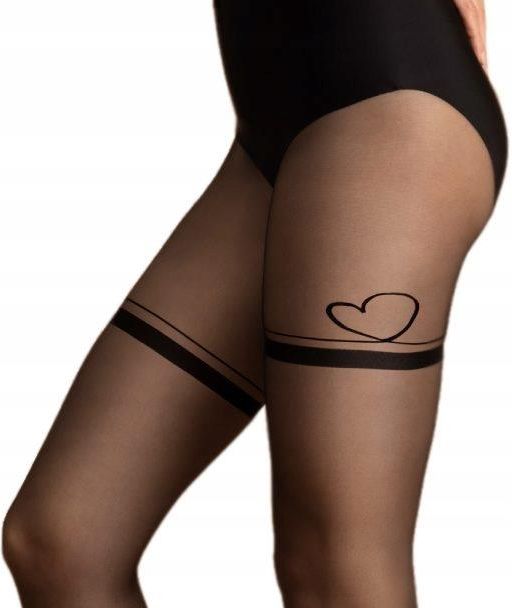 Rajstopy z imitacją podwiązki Fiore TANGLED Opis Cienkie, transparentne rajstopy z imitacją podwiązki Fiore TANGLED. Książę z bajki na białym koniu? Czasem zjawia się jak na zawołanie, jednak z reguły historie miłosne są znacznie bardziej poplątane. Tak czy inaczej, zawsze liczymy na bajkowe zakończenie. Tak jak linie splątane na udach naszych rajstop tworzą finalnie romantyczny kształt serca! Do wyboru wersja ""black on black"" oraz tatuaż na jasnym tle. Rajstopy wzorzyste typu t-band, ultracienkie, transparentne, z komfortowym ściągaczem oraz płaskim szwem. Niewidocznie wzmocnione palce. Bawełniany klin w rozmiarach 3 i 4. Skład surowcowy: 88% Poliamid, 12% Elastan 86% Poliamid, 12% Elastan, 2% Polipropylen Parametry Kolor: czarny Grubość DEN: 10 Materiał dominujący: Poliamid Cechy: wzór typ: Rajstopy damskie wzorzyste Rodzaj: Rajstopy Kolorystyka ogólna: czerń Płeć: kobieta