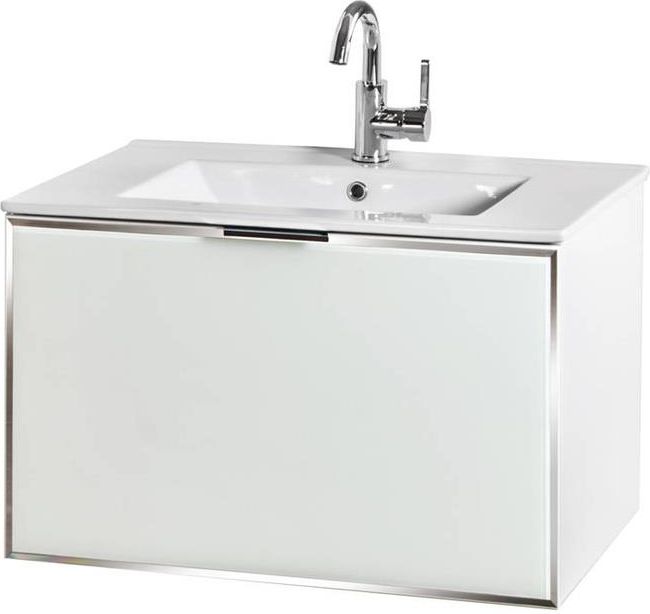 Wisząca szafka łazienkowa Delta o szerokości 70 cm pod umywalkę meblową lub blat. Szafka ze szklanym frontem z fazowaną lustrzaną obwódka. Chromowany metalowy uchwyt. Szafka z jedną głęboką szufladą.