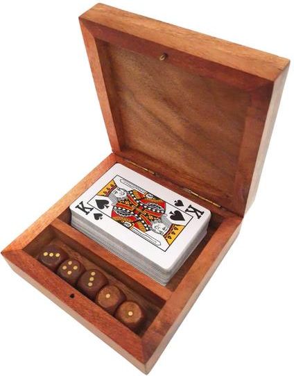 Te dwie klasyczne gry dają wiele możliwości rozgrywek gwarantując rozrywkę na długie, wieczorne godziny. Dzięki kartom zagrasz w pokera lub w brydża. Kośćmi zagrasz chociażby w Yahtzee lub użyjesz ich jako kości do planszówki. Klasyczne drewno w połączeniu z efektownymi zdobieniami mosiężnymi sprawiają, że zestaw ten emanuje niepowtarzalnym urokiem. To także doskonały prezent dla pasjonata gier. Wymiary pudełka: 11,4 x 11,4 cm mamy dużo innych gier , zobacz koniecznie Grawer dokupisz za 39,99 zł płatne na konto wykonujemy grawer laserowy na złotej laminowanej płytce którą przytwierdzimy w miejscu które widzisz na przykładzie, wewnątrz pudełka przedmiot z grawerem nie podlega zwrotowi i musi być wcześniej opłacony GMSO133n2319