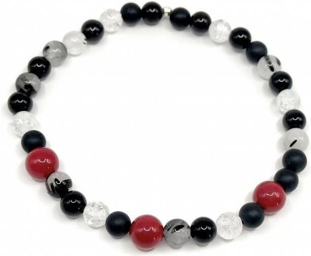 Bransoletka wykonana na gumce Kamień: Koral+ Agat+ Kwarc+ Kryształ Rozmiar kamienia: 6mm Rozmiar uniwersalny. Produkt wykonywany ręcznie.