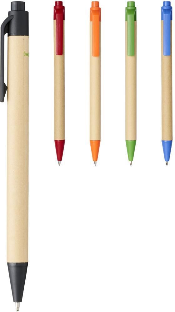 Przyjazny dla środowiska długopis automatyczny z korpusem wykonanym z ulegającego biodegradacji materiału papierowego i wykończeniami z plastiku kukurydzianego dostępny w różnych kolorach. Kolor kartonu z recyklingu może się różnić.