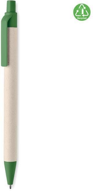 Długopis z kartonu po mleku Stan: Nowy Wymiary (cm): Ø0,9 x 13,9 cm Waga (kg): 0.007 Kolory: Zielony Przyciskany długopis z korpusem wykonanym z kartonów po mleku pochodzących z recyklingu i z elementami z PLA (w 100% biodegradowalnej kukurydzy). Niebieski tusz.