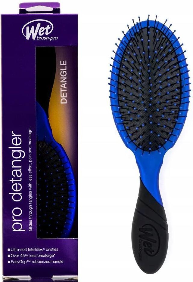 WET BRUSH Szczotka PRO Detangler ROYAL BLUE Marka szczotek do włosów Wet Brush została opracowana z myślą o sprawnej i bezbolesnej pielęgnacji włosów, a w szczególności ich łatwym rozczesywaniu. Szczotki te umożliwiają rozplątanie nawet najbardziej niesfornych włosów przy jednoczesnym zachowaniu ich w dobrej, wzmocnionej kondycji. Szczotka do codziennego użytku, polecana do stosowania do każdego typu włosów bez względu na ich strukturę i długość. Przeznaczona do rozczesywania włosów suchych, mokrych lub wilgotnych. • Z łatwością rozczesuje splątane kosmyki • Zapewnia bezbolesne, łatwe szczotkowanie • Delikatnie masuje skórę głowy • Zapobiega łamaniu i uszkadzaniu się włosów • Wiele kolorów do wyboru Dzięki zastosowaniu innowacyjnej technologii Intelliflex kolce szczotki są cienkie, lecz jednocześnie bardzo wytrzymałe i elastyczne. Dzięki temu podczas czesania włosów z łatwością wyginają się i dostosowują do potrzeb włosów, a następnie wracają do swojej naturalnej pozycji. Dodatkowo formuła SofTips zapewnia miękkie wykończenia kolców, które delikatnie masują i pobudzają skórę głowy. Rezultat: Bezbolesne, szybkie i wzmacniające szczotkowanie włosów.