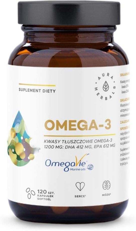 Aura Herbals Omega-3 1200 mg 120 kapsułek Najważniejsze właściwości Aura Herbals Omega-3 1200 mg 120 kapsułek: skoncentrowana formuła atrakcyjny wskaźnik TOTOX równy 10 zawiera nienasycone kwasy tłuszczowe (NNKT) omega-3, w tym EPA i DHA łatwa suplementacja wysoka jakość Aura Herbals Omega-3 1200 mg 120 kapsułek to wysokiej jakości suplement diety, opracowany z myślą o wspieraniu zdrowia serca, mózgu oraz ogólnego funkcjonowania organizmu. Produkt ten dostarcza cenne kwasy tłuszczowe omega-3, które są niezbędne dla zachowania optymalnego stanu zdrowia. Kwasy tłuszczowe omega-3, zawarte głównie w rybach morskich, takich jak łosoś, makrela czy sardynki, są kluczowymi składnikami diety, które organizm nie jest w stanie samodzielnie syntetyzować. Dlatego suplementacja omega-3 może być istotna, zwłaszcza w przypadku osób, które nie spożywają wystarczającej ilości ryb morskich w codziennej diecie. Aura Herbals Omega-3 1200 mg 120 kapsułek dostarcza odpowiednio wysoką dawkę omega-3, co pozwala na łatwe i wygodne uzupełnienie diety w te cenne składniki. Produkt ten jest szczególnie polecany dla osób dbających o zdrowie serca, pracujących umysłowo oraz aktywnych fizycznie. Podsumowując, Aura Herbals Omega-3 1200 mg 120 kapsułek to skuteczny suplement diety, który dostarcza cenne kwasy tłuszczowe omega-3. Produkt ten może być wartościowym uzupełnieniem diety dla osób pragnących zadbać o swoje zdrowie i dobre samopoczucie. Składniki: Składnik - 4 kapsułki (%RWS) Kwasy omega-3, w tym: - 1200 mg (-) kwas EPA - 612 mg (-) kwas DHA - 412 mg (-) Olej rybi OmegaVie®(źródło kwasów tłuszczowych, w tym EPA i DHA), żelatyna rybia, substancja utrzymująca wilgotność: glicerol, przeciwutleniacze: mieszanina tokoferoli (soja); ekstrakt z rozmarynu. Sposób użycia 2 kapsułki popić wodą. Stosować dwa razy dziennie. (opakowanie zawiera 60 porcji). Przeciwwskazania Produkt nie może być stosowany jako substytut zróżnicowanej diety. Zrównoważony sposób żywienia oraz zdrowy tryb życia są podstawą prawidłowego funkcjonowania organizmu. Nie należy przekraczać zalecanej porcji do spożycia w ciągu dnia. W przypadku stosowania leków lub innych suplementów diety należy skonsultować z lekarzem. Przechowywanie Przechowywać w temperaturze pokojowej. Chronić przed wilgocią. Przechowywać w sposób niedostępny dla małych dzieci. Podmiot odpowiedzialny: Aura Herbals Sp. Z O.O., ul. Grunwaldzka 49/2, Sopot 81-754, NIP 585-149-08-34, REGON: 385786580 SKU: 5902479614229