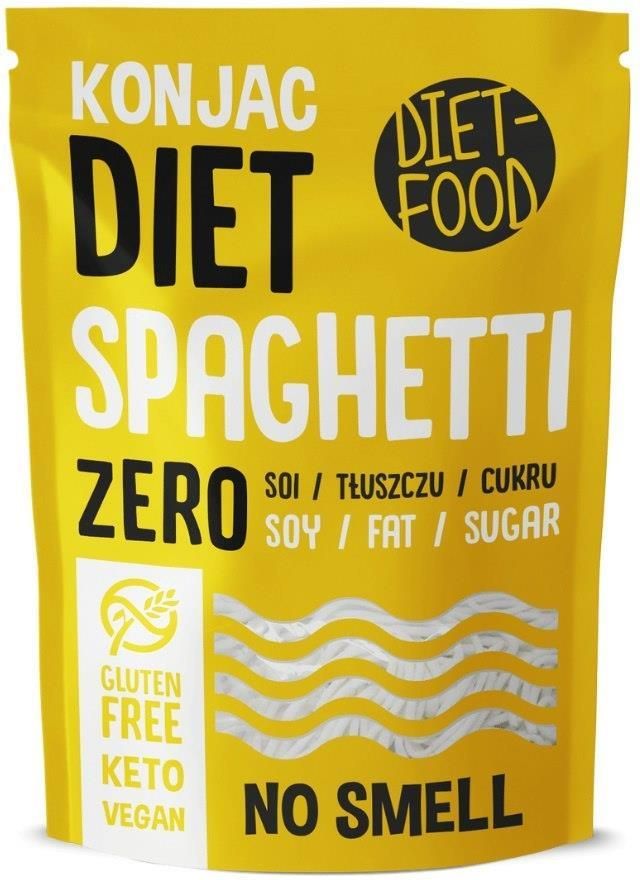 Niskokaloryczny Makaron Konjac Spaghetti Głównym składnikiem Diet Noodles jest Glukomannan konnyak – rozpuszczalny w wodzie błonnik pochodzący z korzenia rośliny Konnyak. Oryginalnie pochodzi ona z Azji, a żywność z niej produkowana nosi również nazwy: Shirataki Noodles lub Konnyak Noodles. Największymi konsumentem tej żywności na świecie są Japończycy. Czym różni się makaron Bio Shirataki Konjac od tradycyjnych makaronów jajecznych? Makaron konjac to naturalny produkt, bogaty w rozpuszczalny błonnik, bez tłuszczu, cukru, skrobi i białka, bez pszenicy i glutenu, bez własnego smaku, łatwo wchłania aromat dodatków i przypraw, szybki w przyrządzeniu, smaczny i zdrowy. Atutem tego makaronu to pochodzenie składników, tylko i wyłącznie z certyfikowanych i kontrolowanych plantacji i dostawców. Czy osoby na diecie wegańskiej mogą spożywać ten makaron? Naturalnie, linia tych wyśmienitych produktów została stworzona typowo dla ludzi stosujących diety wegańskie i wegetariańskie, jednocześnie nie zapominając o świetnym zastosowaniu tego makaronu dla ludzi, którzy borykają się z problemami nieprzyswajania glutenu. Polecamy również jego spożycie przy stosowanej diecie ketogenicznej. W naszej szerokiej ofercie znajdziesz także pozostałe produkty marki DIET-FOOD. Sprawdź nasz cały asortyment! Czekają na Ciebie różnego rodzaju witaminy, minerały, grzyby witalne, zdrowa żywność, ekstrakty roślinne, adaptogeny, produkty poprawiające pracę mózgu oraz preparaty polepszające wytrzymałość i regenerację w sporcie. SKŁAD I INFORMACJA ALERGICZNA woda oczyszczona (96,6%) organiczna mąka z rośliny Konjac (3,4%) Przechowywać w szczelnie zamkniętym opakowaniu w suchym i chłodnym miejscu. Nie zamrażać. Wartości odżywcze w 100 g: wartość energetyczna 30 kJ / 7 kcal tłuszcz < 0,1 g w tym nasycone <0,1 g węglowodany <0,2 g, w tym cukry < 0,1 g błonnik 2,6 g białko <0,1 g sól < 0,1 g Masa netto: 200g (masa netto po odcieku)