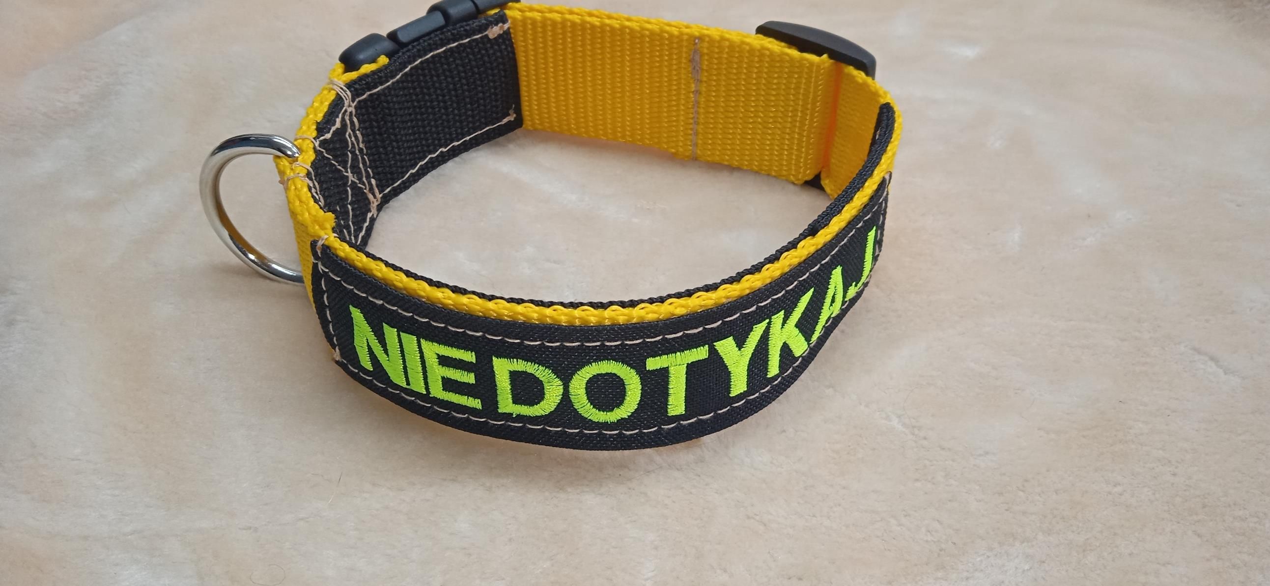 Haft NIE DOTYKAJ Żółta taśma - haft na czarnej codurze Neon żółty Szerokość taśmy 4 cm Mocne, pełne okucia polskiego producenta Klamry w polu wyboru Możliwość wykonania innego haftu lub w kolorystyce - żółta z czarnym haftem czarna z żółtym neonem haft bez naszytej codury