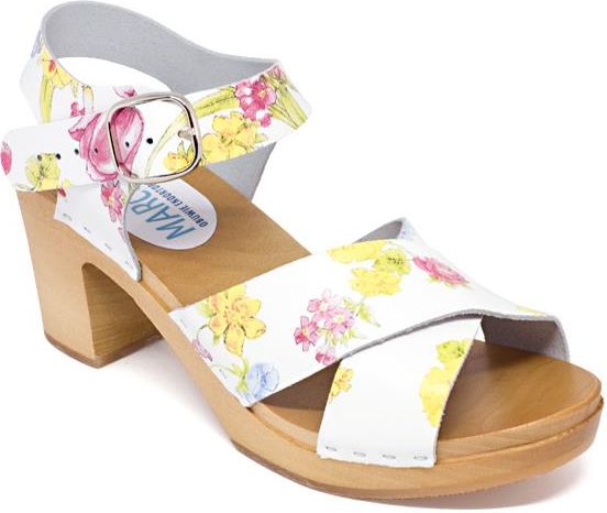 Sandałki na drewnie topola podbite gumką antypoślizgową. Wysokość 7.5 cm. Skóra bydlęca w kwiatki