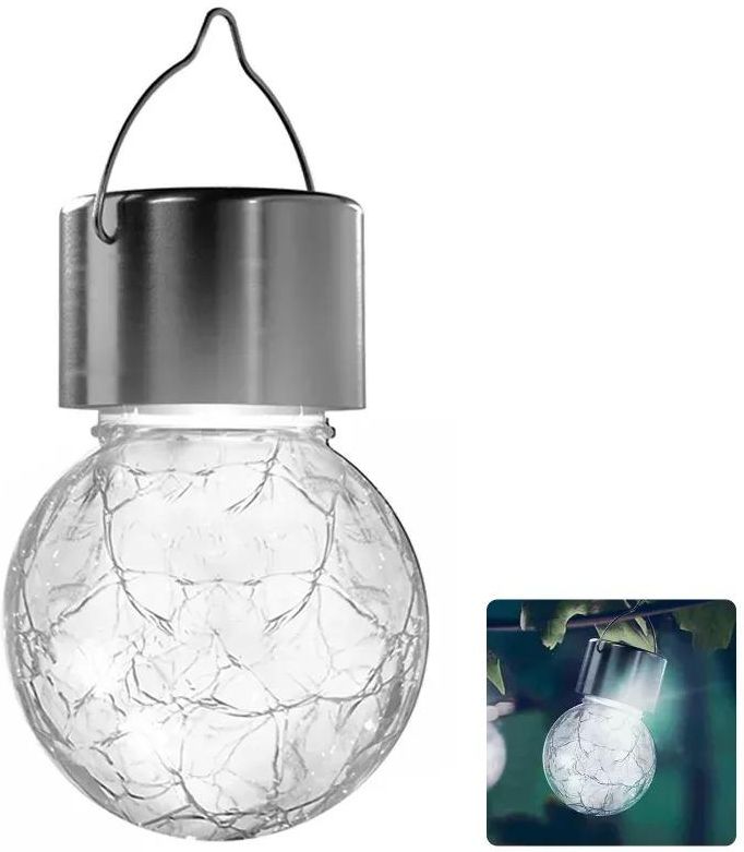 Całoroczna lampa kulka szklana solarna z czujnikiem zmierzchu do dekoracji werandy, podkreślenie elementów małej architektury ogrodowej, uzupełnienie kompozycji roślinnych.Opis i funkcje:Lampa ogrodowa solarna jest idealnym rozwiązaniem dla każdego ogrodu. Oświetlenie podkreśla charakter każdego ogrodu i nadaje uroku. Za jej pomocą możesz oświetlać ścieżki, taras, fragmenty murków, oczka wodne, trawnik itp. Największą zaletą lamp solarnych jest to, że są energooszczędne i nie wymagają montażu okablowania. Panel solarny ładuje wbudowany akumulator, dzięki czemu lampa może świecić w nocy, a Ty możesz cieszyć się oświetleniem bez dodatkowych kosztów za energię elektryczną.ZAWARTOŚĆ ZESTAWU: Kulka solarna Parametry techniczne: Zabezpieczenie IK: IK02 Materiał wykonania: Stal nierdzewna i PP Certyfikaty: CE,RoHS Kolor produktu: Biały Żywotność: 20000h Przeznaczenie: Na zewnątrz Kąt świecenia: 120deg; Strumień świetlny: 1.2lm Maksymalna moc: 0.006W Moc panalu solarnego: 0.018W Parametry panalu solarnego: 2V 9mA0.018W Wielkość panalu solarnego: L25*W25mm Napięcie panalu solarnego: 2V Prąd panalu solarnego: 9mA Rozmiar: L60*W60*H90mm Temperatura działania: -20#8451;~40#8451; CRI: Ra≥70 Kolor światła: Światło dzienne Napięcie: 1.2V Czas pracy baterii/akumulatora: Max.8h Typ baterii/akumulatora: 2/3 AAA 100mAh pojemność akumulatora: 100mAh Pobór prądu: 4mA Typ: Solarne lampy ogrodowe Temperatura barwowa: 6500K Stopień ochrony: IP44 Lampka solarna posiada w przełącznik OFF/ON pozycja ON - włącza kulkę, pozycja OFF - wyłącza (przydatne podczas przechowywania lub transportu)Kula wykonana jest ze szkła ze specjalnymi rysami (spękaniami) co pozwala osiągnąć niesamowity efekt świetlny. Instrukcja montażu: włączyć i powiesić za ucho :)