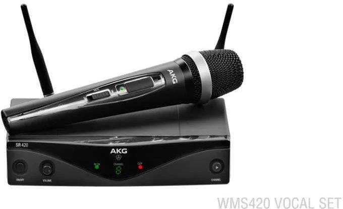 Zestaw bezprzewodowy: odbiornik SR420, nadajnik doręczny HT420 z mikr D5 (1xAA do 8h), uchwyt mikrofonowy, zasilacz, złącza BNC do ewentualnej instalacji, styki ładowania nadajnika, zależnie od wyboru podpasma (1,8-30MHz) -> 4do8 częst do wyboru, moce RFout 10-20-50mW. Zastosowanie: scena na żywo, prezentacje, instalacje stałe Odbiornik z antenami na złączach BNC z możliwością podłączenia zewnętrznej instalacji antenowej Kapsuła profesjonalnego mikrofonu wokalowego D5 zintegrowana w nadajniku doręcznym Nadajniki ze stykami do ładowania bez wyjmowania akumulatorów w opcjonalnej ładowarce (CU400) Od 4 do 8 częstotliwości do ręcznego wyboru i do 4-8 jednoczesnych częstotliwości pracy bez zakłóceń wzajemnych w kilku dostępnych w ofercie podpasmach pracy UHF (30 MHz lub węższych) Moc RFout nadajników 10/20/50mW Zasilanie nadajnika 1 bateria/aku AA do 8 godzin pracy Pasmo audio transmisji 40-20000Hz Elementy do zbudowania zewnętrznej instalacji antenowej – standardowe akcesoria antenowe AKG do serii WMS4500/470/DMS700 – m.in. spliter PS4000w, cztery rodzaje anten dwie RA i dwie SRA2, zasil. kablowy ASU4000, wzm. kablowy AB4000, pasywny spliter-sumator ZAPD21.