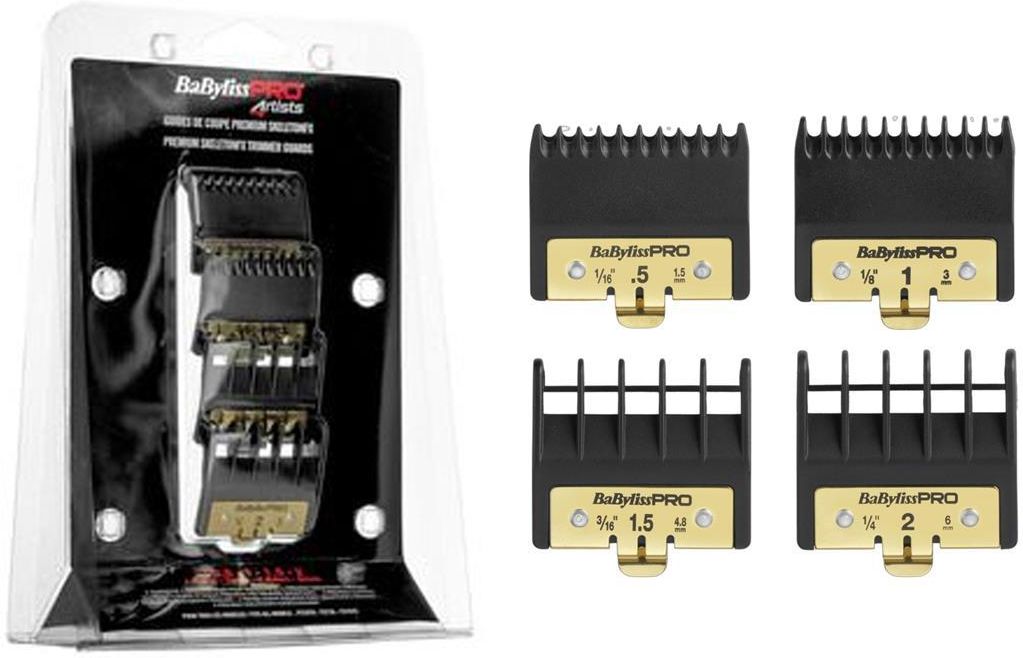 Zestaw do trymerów SKELETON BaByliss PRO 4ARTISTS 4 wysokiej jakości nasadki dedykowanych trymerom: FX7870, FX726, FX797ZE Specyfikacja: 4 różne nasadki o długości (1.5mm, 3mm, 4.8mmm 6mm) numeracja: 0,5-1-1,5-2 Metalowy klips mocno mocuje nasadki do ostrzy Dodatkowo zęby pomagają wprowadzić włosy do ostrza , zapewniając czystsze cięcie