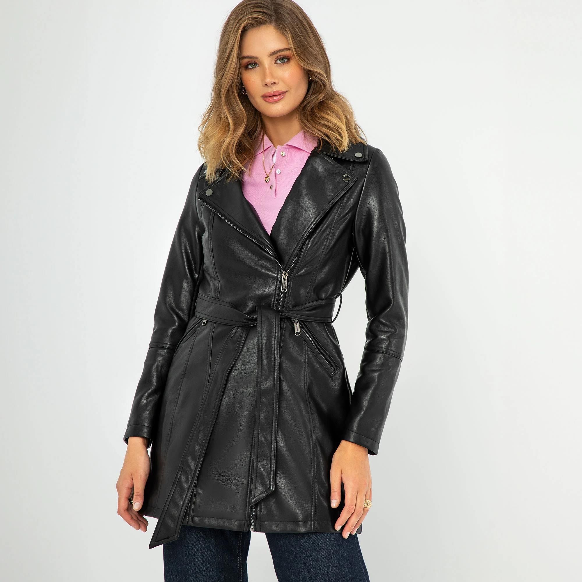 Damski płaszcz z ekoskóry dwurzędowy z paskiem czarny Marki