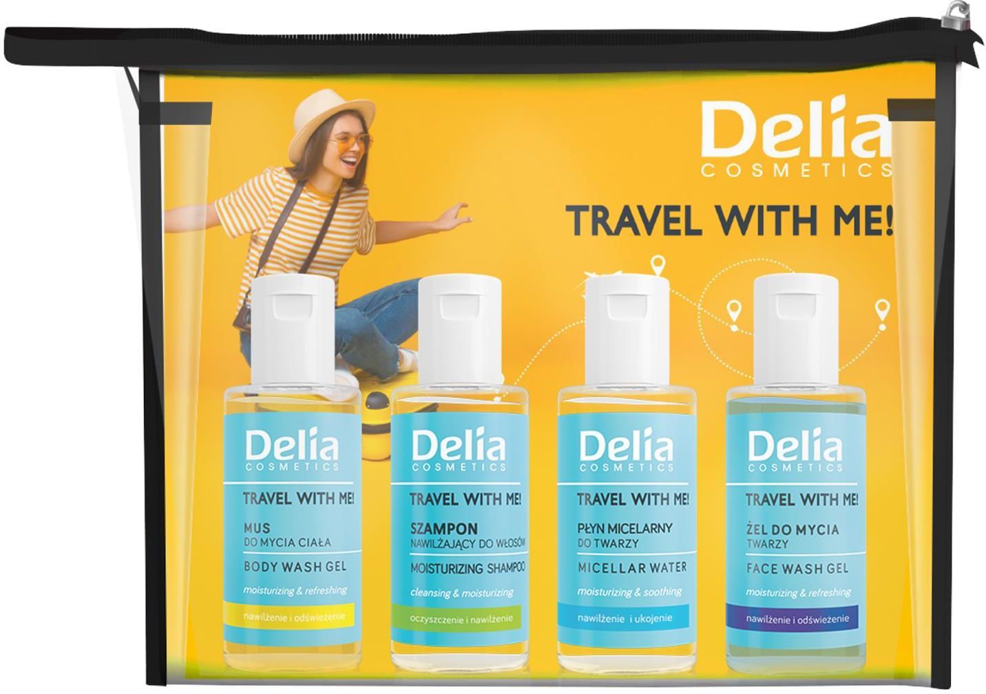 Delia Travel With Me Zestaw: Mus Do Mycia Ciała 50 Ml + Nawilżający Szampon Włosów Płyn Micelarny Twarzy Żel Twarzy Marki