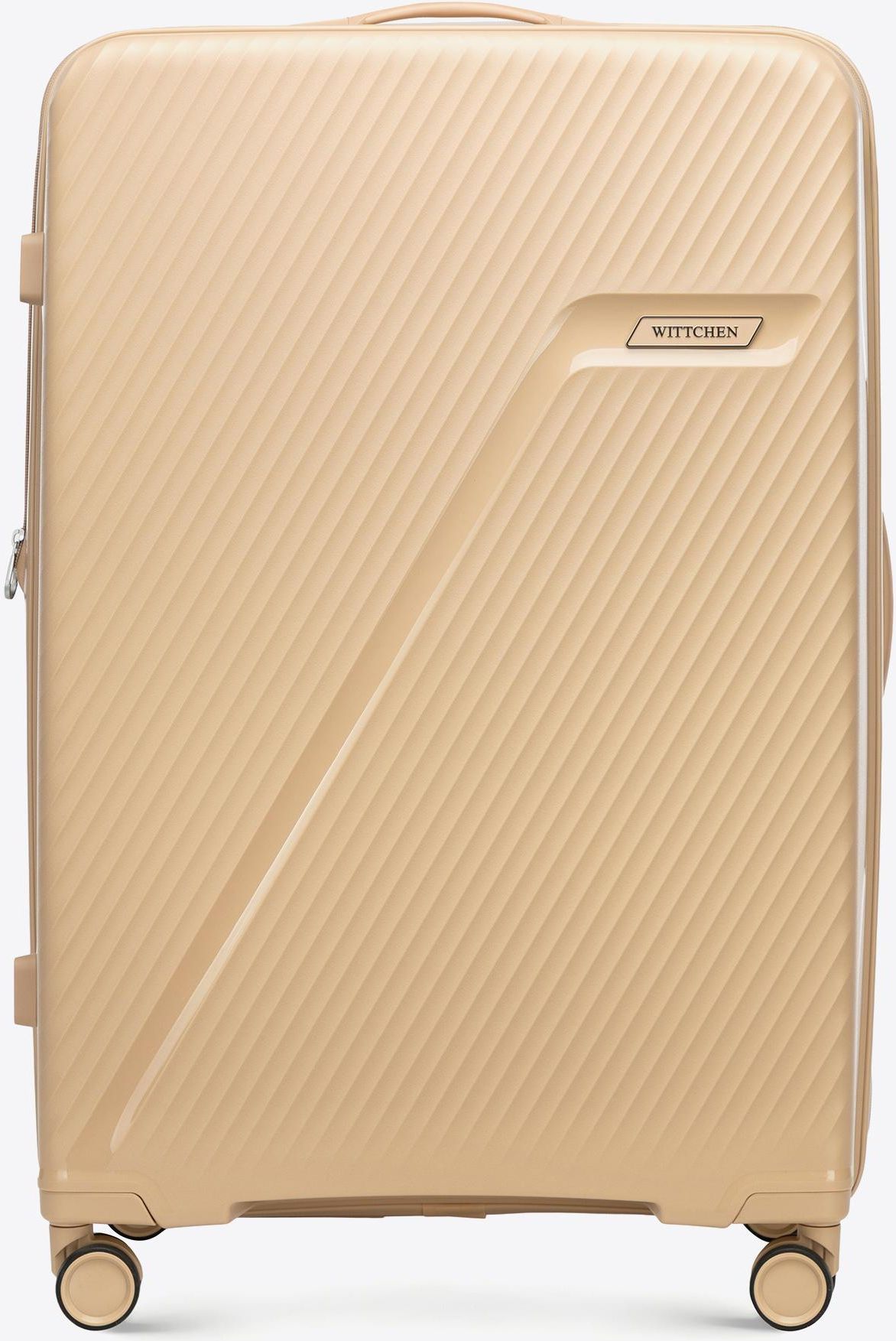 Duża walizka z polipropylenu w ukośne pasy Kod produktu: 56-3T-503-86 Bagaż z opcją poszerzenia i designem, który przyciąga spojrzenia Szukasz walizki , która sprosta wyzwaniom dłuższych podróży i jednocześnie będzie prezentować się stylowo na lotnisku czy w hotelowym lobby? Ten duży model WITTCHEN …