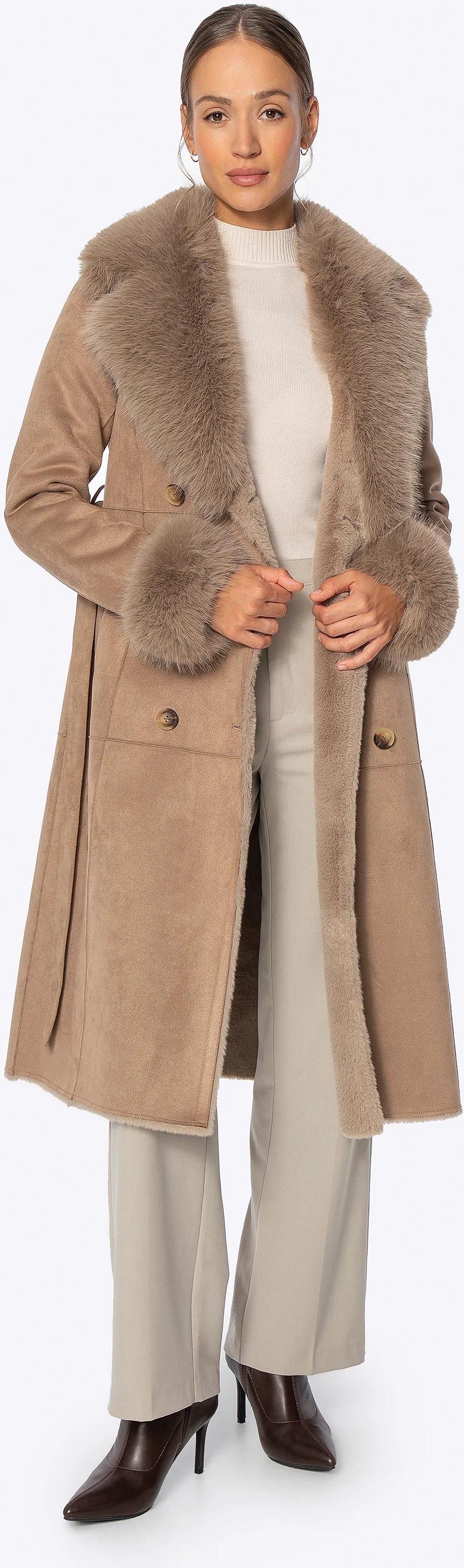 Dwurzędowy damski płaszcz z futrzanym kołnierzem beżowy Marki