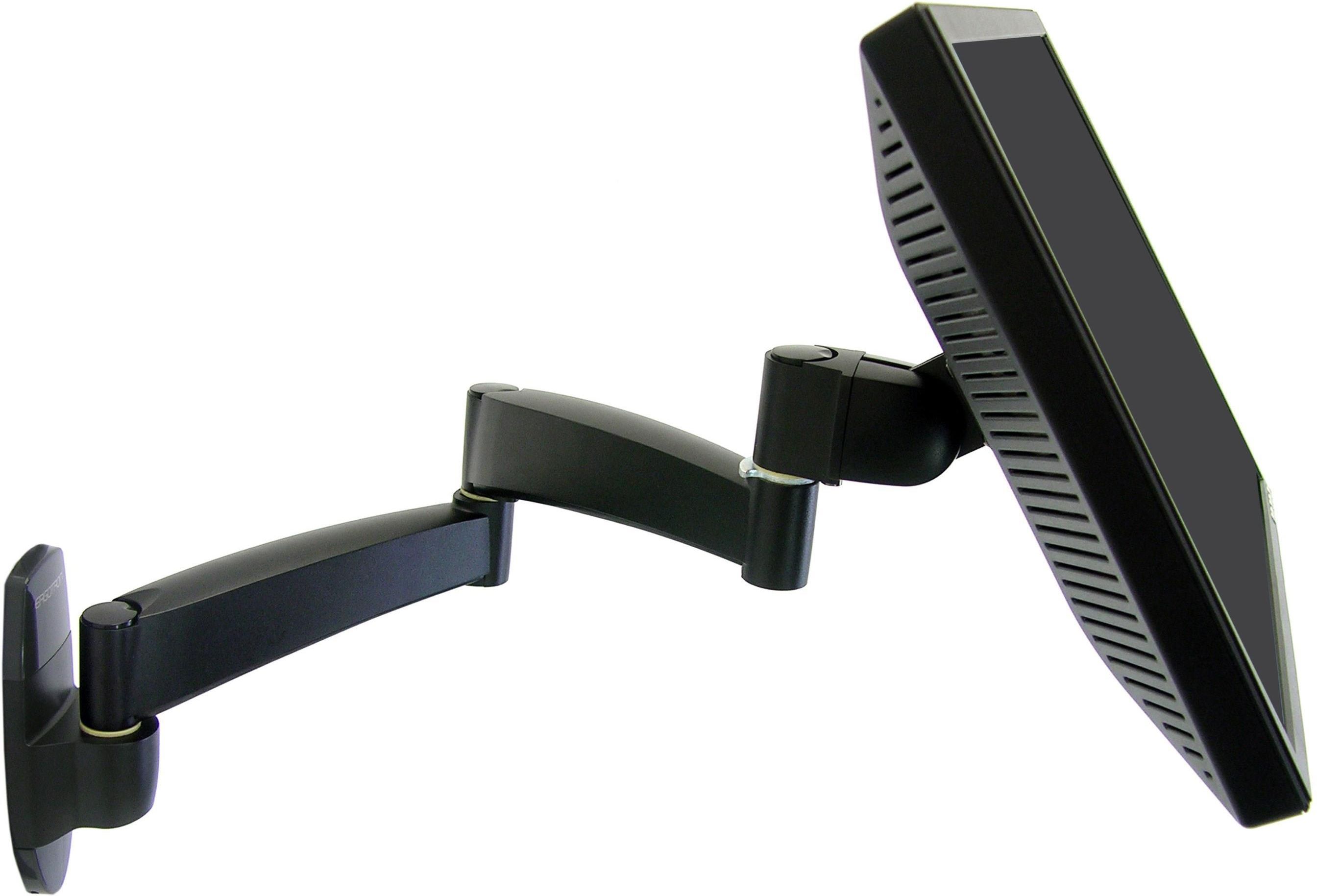 Ergotron – Seria 200 Monitor Arm – uchwyt ścienny do monitora z trzema przegubami (czarny) Indeks: ERGO45234200 Numer katalogowy: 45-234-200 Trzyprzegubowy uchwyt z serii 200 rozkłada się na maksymalną długość 60 cm, a także umożliwia odchylanie ekranu w pionie i w poziomie. Dzięki niemu z łatwością umieścisz monitor dokładnie tam, gdzie go potrzebujesz. 5 LAT GWARANCJI   Cechy produktu Funkcjonalność – Po rozłożeniu na maksymalną długość ramię ma 60 cm, natomiast po złożeniu zajmuje zaledwie 17 cm. Ekran można odchylić w pionie i w poziomie oraz obrócić do pozycji portretowej. Ramię gwarantuje stabilność niezbędną podczas korzystania z paneli dotykowych. Schludny wygląd –  Kable poprowadzone są wewnątrz ramienia, poza zasięgiem wzroku. Wytrzymałość – Stalowa konstrukcja zapewnia wyjątkową trwałość.   Specyfikacja Maksymalna przekątna ekranów: 32” Nośność: do 11,3 kg Regulacja w pionie: - Odchylenie w pionie: 180° Obrót w poziomie: 360° Obrót ekranu: 90° Standard VESA: MIS-D