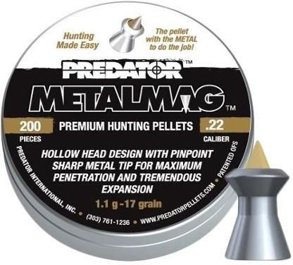 JSB Predator Metalmag .22 wyprodukowany we współpracy z amerykańskim partnerem, unikalny śrut klasy Premium Quality Hunting Pellets o bardzo dużej przebijalności w kal. 5,5 mm. Amunicja charakteryzuje się innowacyjną budową, łączy wykonany z metalu ostry czubek typu Pointed (szpic) oraz ołowiany płaszcz typu Hollow (wklęsły) w jedną śrucinę. Gładki kielich bez moletowania. Opakowanie 200 sztuk. Wysokiej jakości ciężki, precyzyjny śrut o dużej penetracji, przy uderzeniu oddaje całą energię w cel. Kontrolowana ekspansja. Najskuteczniejsza amunicja do polowań, idealny śrut destrukcyjny do rozbijania celów. Aerodynamiczny kształt dzięki plastikowej końcówce. Wysoka jakość wykonania gwarantuje wyśmienitą celność. Do strzelania na średnich dystansach. Pointed - śrut o szpiczastej główce zapewnia najlepszą przebijalność celu, gwarantuje stabilny tor lotu również dla mocnych wiatrówek vo=250 m/s o energii 16-17 J. Hollow Point - śrut z wgłębieniem na czole, przy uderzeniu ulega całkowitemu spłaszczeniu (eliminując zjawisko rykoszetu) i oddaje całą energię w cel. Rekomendowany do mocnych wiatrówek pneumatycznych (FAC) marki Hatsan Arms. Karabinów PCP: AT-44, BT65, GALATIAN, HERCULES, NOVA, TROPHY, GLADIUS, BULLBOS. Karabinów tłokowych sprężynowych oraz wyposażonych w sprężynę gazową VORTEX m.in. MOD 55S, MOD 70, MOD 80, MOD 90, MOD 95, MOD 125, MOD 135, TORPEDO 100X, TORPEDO 105X, TORPEDO 150, TORPEDO 155, STRIKER EDGE, STRIKER AR, STRIKER 1000, APACHI, PROXIMA. Dane techniczne: Numer produktu: 2002-01-200 Nazwa: Predator Metalmag .22 Kaliber: 5.5 mm / .22 Masa: 1.10 g / 17.00 gr Kształt: Pointed & Hollow Kielich (skirt): Gładki Materiał: Ołów & Metal Opakowanie: 200 szt. Producent: JSB, Republika Czeska Opracowanie: firma Sharg®