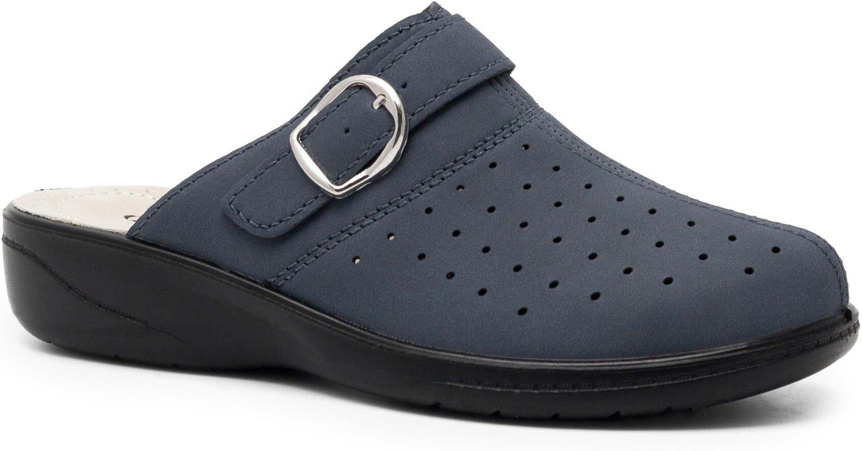 Klapki marki Clara Barson to idealny wybór dla kobiet ceniących sobie wygodę i swobodę ruchów. Ich granatowy kolor jest bardzo modny, co sprawia, że doskonale wpiszą się w letnie, casualowe stylizacje. Buty są wsuwane, co pozwala na błyskawiczne założenie i zdejmowanie ich, z kolei okrągły nosek zapewnia dużą wygodę podczas chodzenia. Wykonanie z wysokiej jakości syntetyku sprawia, że klapki są trwałe i łatwe w utrzymaniu czystości. To must-have każdej modnej kobiety na lato!