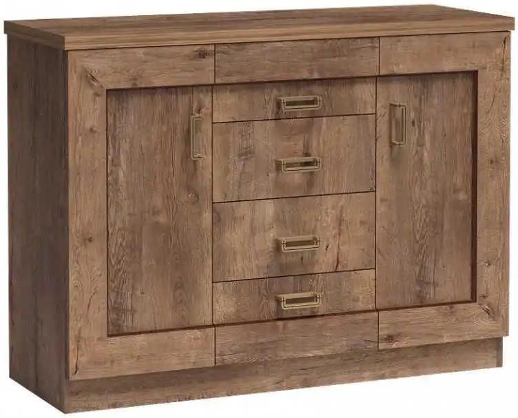 Komoda 120 duża 4 szuflady szafki z półkami meble do salonu Tadeusz T-5 Komoda Tadeusz T-5: - wymiary: (szer x wys x gł) 120 cm x 90 cm x 44 cm - komoda dostępna w dwóch kolorach: ( proszę podać podczas składania zamówienia- w przypadku braku podania koloru mebel zostanie wysłany w kolorze ze zdjęcia) dąb lefkas (na zdjęciu) dąb stuletni - duża komoda w środkowej części posiada przestrzeń w z 4 szufladami, ponadto po zewnętrznych stronach znajdują się szafki za frontem których znajduje się po jednej półce - meble w stylu angielskim Szczegóły wykonania mebli systemowych TADEUSZ: brył wykonane z płyty laminowanej gr 16 mm krawędzie, grzbiet płyty zakończony okleiną ABS odporną na zadrapania plecy, tył mebli wykończony płytą HDF zawiasy metalowe uchwyty metalowe meble dostępne w dwóch kolorach: dąb lefkas oraz dąb stuletni meble w paczkach do samodzielnego montażu wraz z dołączoną instrukcję oraz niezbędnymi okuciami do montażu ( śruby, mimośrody, kołki, wkręty, itp...) Polski producent Kolorystyka: