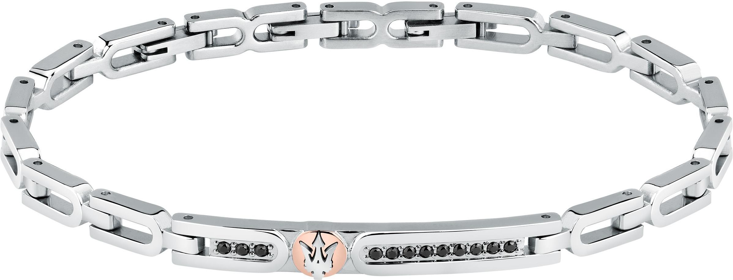 fajna bransoletka wykonana z polerowanej stali nierdzewnej, szerokość 6,5 mm, długość 18,5 cm + 3 cm przedłużenia, wysadzana czarnymi kryształkami, polerowane logo na tarczy ze stali nierdzewnej pokrytej jonami różowego złota, wygodne składane zapięcie z logo Biżuteria Maserati: idealne połączenie elegancji i sportowego charakteru: mieszanka włoskiego stylu i pasji do jazdy, która nie zna rywali.