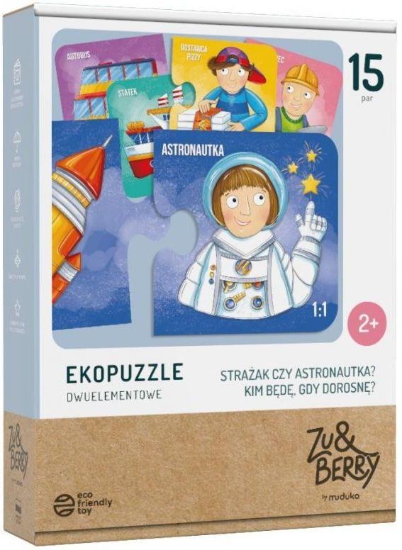 Ekopuzzle dwuelementowe: "Strażak czy astronauta?" dla dzieci od 2 lat Ekopuzzle "Strażak czy astronauta?" to zestaw 15 dwuelementowych puzzli dedykowany dzieciom od 2 lat. Dzięki nim najmłodsi uczą się różnych zawodów, łącząc reprezentantów profesji z odpowiednimi pojazdami. Puzzle są nie tylko zabawą, ale również okazją do rozmowy z dzieckiem na temat marzeń, przyszłości i zainteresowań związanych z pracą. W zestawie znajduje się również poradnik z zadaniami, które wspierają rozwój umiejętności dziecka. Dodatkowe ciekawostki przedstawione w materiale poszerzają wiedzę nie tylko najmłodszych, ale również rodziców. Innowacyjne podejście do opakowania: wnętrze pudełka można pokolorować, a po rozłożeniu ukazują się interesujące historyjki o bohaterach serii. Dzięki temu pudełko zyskuje "drugie życie" i staje się elementem zabawy, wspierając ekologię. Zalety ekopuzzli "Strażak czy astronauta?" forma i tematyka puzzli dostosowana do wieku i umiejętności dziecka, rozpoczęcie dyskusji na temat zawodów i ich wpływu na społeczeństwo, poradnik z kreatywnymi zadaniami i pytaniami do zadawania dziecku, ekologiczne i biodegradowalne wykonanie puzzli oraz opakowania, ponowne wykorzystanie pudełka, które można pokolorować. Ekopuzzle "Strażak czy astronauta?" są częścią serii "Ekopuzzle dwuelementowe", w której dostępne są również: "Zaprzyjaźnij się z owadami" - dla dzieci od 18 miesięcy, "Dinozaury i ich dzieci" - dla dzieci od 2 lat. Propozycje zabaw z ekopuzzlami Dopasuj elementy puzzli do siebie tworząc pary, Wykonuj zadania z poradnika (naśladuj dźwięki pojazdów, odgrywaj różne zawody) i baw się z dzieckiem! Zawartość opakowania pudełko (wnętrze do pokolorowania), 15 par dwuelementowych puzzli, poradnik z zadaniami i ciekawostkami. Informacje handlowe wymiary puzzli: 110 x 110 mm, rozmiar opakowania: 212 x 282 x 57 mm, EAN: 5904262954420, Wydawca: Zu&Berry by Muduko. EAN: 5904262954420